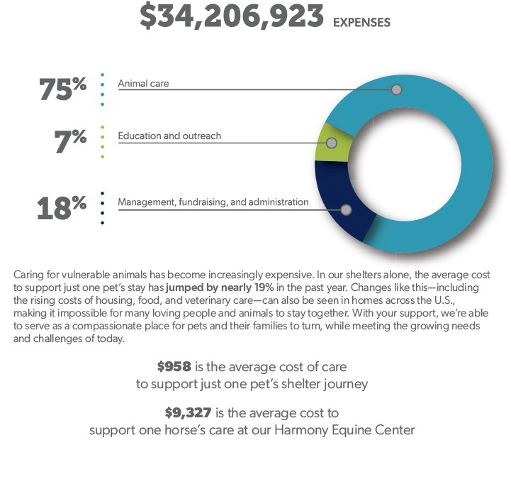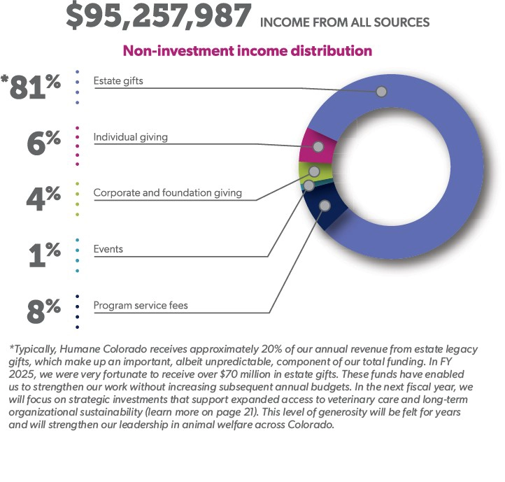 Fiscal Year 2025 Overview We believe in being good stewards of our financial assets. Relying on the Colorado community to support our mission, we are proud that 82 cents of every dollar goes to animal care services, education, and outreach.