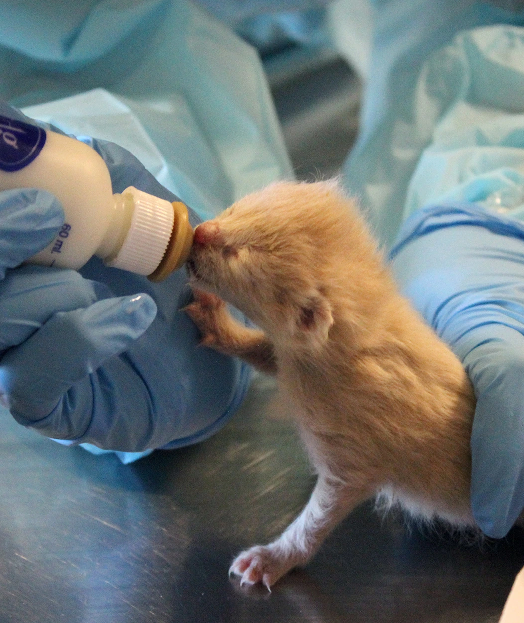 Newborn kittens 0-2 weeks old Newborn kittens have closed eyes and folded ears. The kittens cannot stand or walk but are learning to orient towards sound. Mom is usually present with newborns, nursing and caring for her litter diligently, but may leave them for a few hours at a time. Separation from their mother and littermates at this point can lead to poor learning skills and aggression towards people and other pets, including other cats.